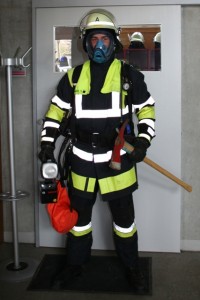 Muss der Einsatztrupp zur Brandbekämpfung in ein Haus vorgehen, trägt er immer zusätzlich ein Atemschutzgerät. Seine unter 300 bar stehende Druckluftflasche spendet dem Feuerwehrmann ca. 30 min Atemluft. Außerdem trägt er eine Flammschutzhaube, damit alle Bereiche des Gesichts vor Hitze geschützt sind. Zusätzlich kommen standardmäßig noch weitere Ausrüstungsgegenstände dazu: